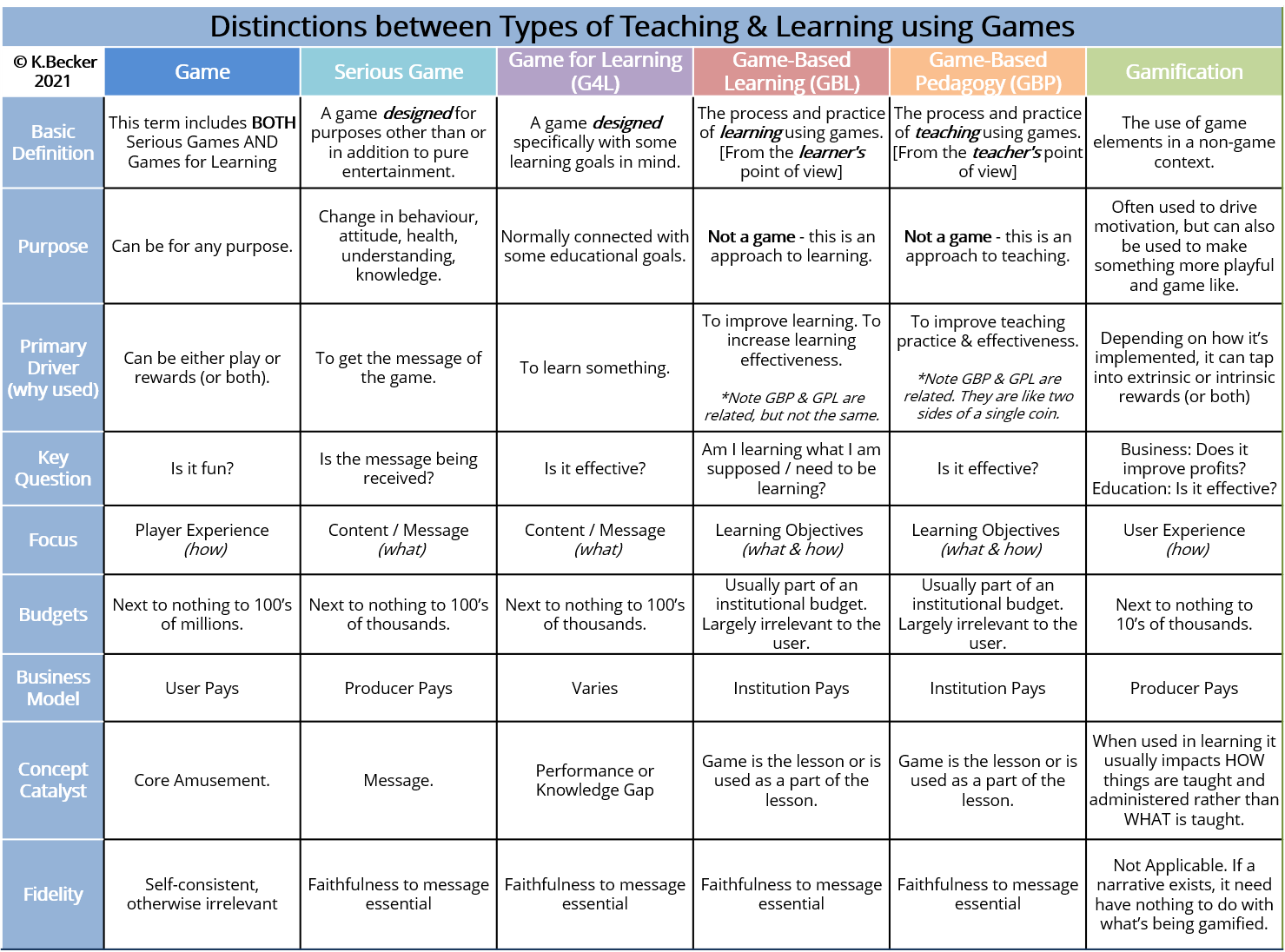 Becker, K. (2021). What’s the difference between gamification, serious games, educational games,and game-based learning? Academia Letters, Article 209. https://doi.org/10.20935/AL209